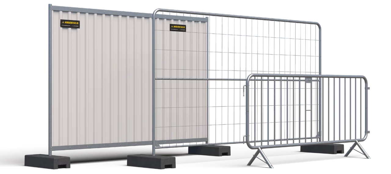 - Hálós mobilkerítés: Tűzihorganyzott acélcső keretből és hegesztett acélhuzal hálóból áll. Több területen alkalmazható, eredményes és olcsó megoldás. Különböző típusai léteznek (pl. PRO STANDARD, PRO ECO, PRO MAX), amelyek a stabilitásukban és kialakításukban különböznek.